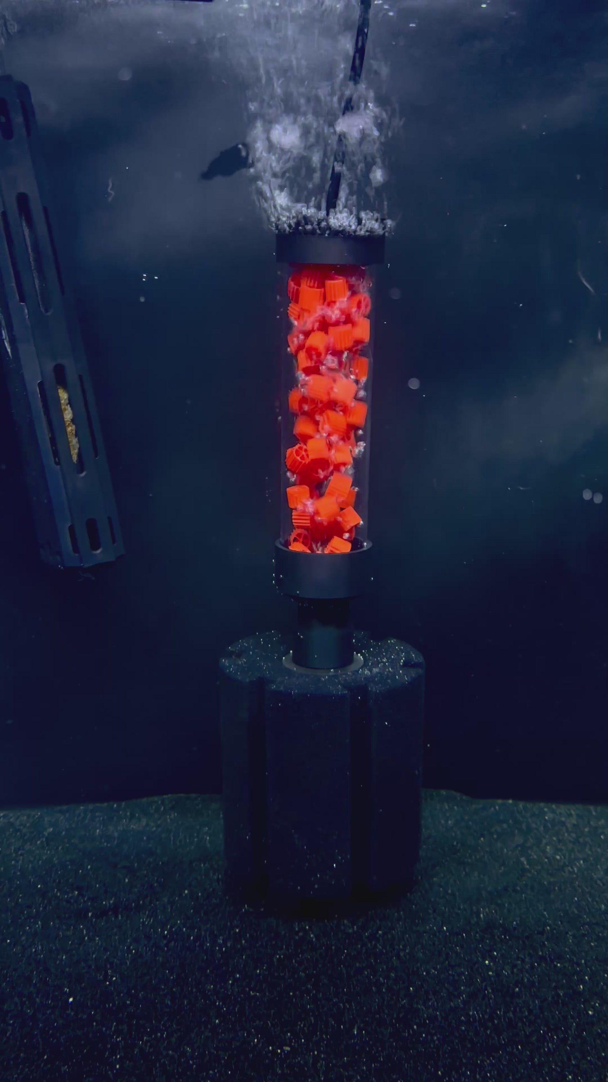 Fluidized media is the gold standard for monster tanks for two reasons: massive biological surface area and zero maintenance. While HOB ceramic rings clog with waste and lose their efficiency within weeks, our moving-bed technology is 100% self-cleaning. The tumbling K1 media continuously sheds dead biofilm, maintaining maximum ammonia-processing power for heavy-bioload predator tanks—with zero maintenance required.
