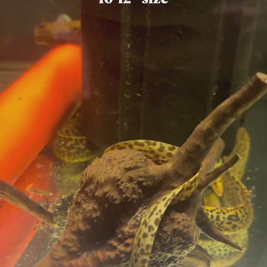 The Freshwater Tiger Moray Eel, also known as Gymnothorax polyuranodon, is a species of eel that is native to the freshwater rivers and streams of Southeast Asia. They are known for their striking appearance, with a pattern of dark stripes on a light background, resembling the spots of a leopard. My eels are all wild caught without hooks in Indonesia. Traditionally they are caught with hooks and may sustain damage which could lead to death by food strike or infection.